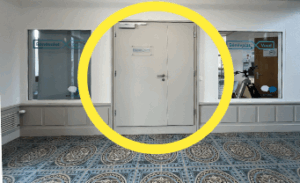 (Entrer dans le bâtiment et prendre la première porte à gauche. La salle est tout droit, au fond de la pièce.)